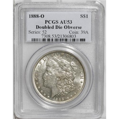 <B>1888-O<img border='0' src='http://www.heritagecoins.com/images/star.gif' width=10 height=10>$1> Doubled Die Obverse AU53 PCGS.</B></I> VAM-4. Top 100 Variety. The "Hot Lips" variety, which has clear die doubling on Liberty's mouth and nose. The bases of ERT in LIBERTY are absent, as made because of a lapped die. Light silver-gray surfaces reveal just a few minute scattered marks. Population: 22 in 53, 28 finer (7/06).
