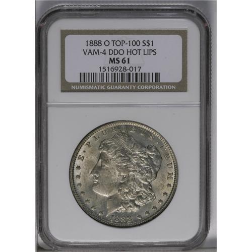 <B>1888-O<img border='0' src='http://www.heritagecoins.com/images/star.gif' width=10 height=10>$1> MS61 NGC.</B></I> VAM-4, "Hot Lips." A Top 100 Variety. This famous and desirable Morgan dollar is popular not only because of its listing as a <I>Guide Book</B></I> variety, but also because of the dramatic die doubling visible at the mouth, chin, nostrils, and profile. The Fey-Oxman <I>Top 100</B></I> guide comments of this issue, "The Number One doubled die obverse in the Morgan dollar series. Only 1 BU known." <B>This is the single highest graded of this variety at either service, and the only certified MS61 example (6/06).</B></I> Fey and Oxman list this MS61 coin at the top of their Condition Census. Since that book was published in 1997, NGC has certified only one more Mint State coin, an MS60, which would place it second in the Condition Census. PCGS has certified no Mint State examples. While this coin has some light field chatter, reeding marks, and other abrasions consistent with the MS61 grade, there is absolutely no trace of rub on the highpoints, with unbroken, if subdued luster flowing throughout. Both sides are brilliant, with no trace of toning. The reverse die is slightly rotated counterclockwise. For a Morgan dollar specialist collecting the finest set of VAM keys or <I>Guide Book</B></I> varieties, this coin is simply irreplaceable, as well as unimprovable.