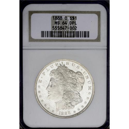 <B>1888-O<img border='0' src='http://www.heritagecoins.com/images/star.gif' width=10 height=10>$1> MS64 Deep Mirror Prooflike NGC.</B></I> Sparkling mirrored fields and a nice application of frost bring forth a very pleasing prooflike coin. Numerous small luster breaks in the field. There are also a couple of small frost breaks. Both are common for this series and grade. <BR><BR><B>Important notice:</B> Heritage usually auctions material at the rate of 200-250 lots per hour. On some occasions eBay Live bid software or the Internet may not be able to keep up with the pace of the auction. We recommend placing a realistic absentee bid now as insurance to avoid disappointment. Occasionally the auctioneer may eliminate or reject an eBay Live bid, and the auctioneer may also reopen a lot after the close of the eBay live bidding (usually because we missed an audience bid), and may reject your bid even if it shows you as the winning bidder. By bidding via eBay Live, you agree that Heritage may award the lot to another bidder at its sole discretion under the circumstances described above or any other reasonable circumstances. Since eBay bids are not shown to us until we open the lot on the floor, we treat those bids just like floor bids. In most cases the floor responds before the eBay bid is presented to us, due to Internet lag time, so for consistency we have made it a policy that floor bids are always considered first over tie eBay live bids. Also please note that all Heritage lots purchased through eBay Live carry a 20% Buyer's Premium. Please make sure you read the Terms and Conditions before you bid. This lot is being auctioned in conjunction with a live floor auction by Heritage Galleries & Auctioneers. All final auction and invoice information will be supplied by Heritage Galleries & Auctioneers, and all other information should be considered preliminary. Lot:3491 <BR><BR><B>Winning Notification and Billing:</B> After the FINAL session in this auction is complete, Heritage will send e-mail and snail mail invoices. This process normally takes several days. All final auction and invoice information will be supplied by Heritage Galleries & Auctioneers, and all other information should be considered preliminary. <BR><BR>This auction will be conducted on a live auction floor and over the Internet through eBay Live. If you choose to place an absentee bid, please take a moment to <font color='#0000ff'><u><a href='http://pages.ebay.com/liveauctions/help/before/laabsentee.html'>learn how eBay Live absentee bidding works</a></u></font><font color='#000000'>