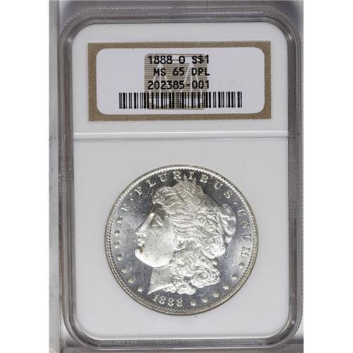 <B>1888-O<img border='0' src='http://www.heritagecoins.com/images/star.gif' width=10 height=10>$1> MS65 Deep Mirror Prooflike NGC.</B></I> An extremely prooflike and pleasing example of this date, and quite unusual as such. All devices are frosted, providing pleasing contrast. One slight toning spot, in evidence on Liberty's chin, is mentioned for accuracy but is unobtrusive. Census: 27 in 65, 4 finer (8/06).