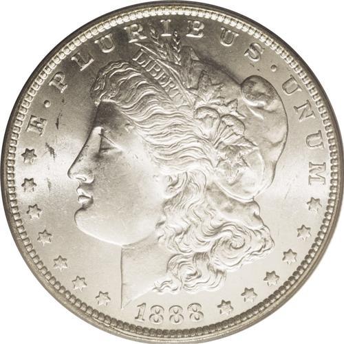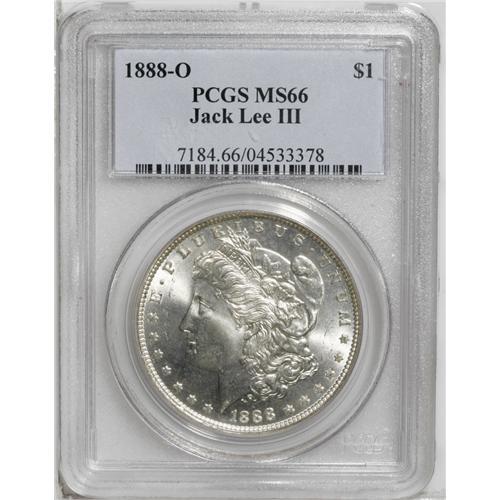 <B>1888-O<img border='0' src='http://www.heritagecoins.com/images/star.gif' width=10 height=10>$1> MS66 PCGS.</B></I> Ex: Jack Lee III. Like so many other Morgan Dollars from the New Orleans Mint, nearly the entire mintage remained in Treasury vaults for several decades, with few released to circulation at the time they were coined. The first large release of these coins occurred shortly after World War II, and continued until the Treasury disbursements of the early 1960s. While this issue was not the rarity of certain other New Orleans Mint issues, it was decidedly elusive for nearly 60 years. Today, however, it is one of the more plentiful dates in the Morgan series. This example is fully brilliant with frosty luster and excellent eye appeal. The surfaces are untoned and exhibit few surface marks of any sort. It is an exceptional example, and among the finest certified by PCGS.
