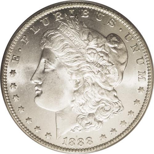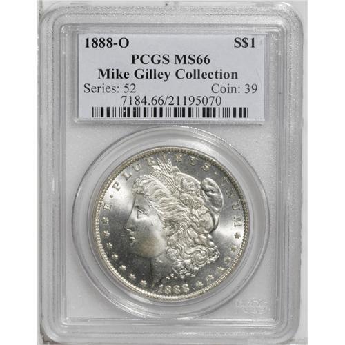<B>1888-O<img border='0' src='http://www.heritagecoins.com/images/star.gif' width=10 height=10>$1> MS66 PCGS.</B></I> Ex: Mike Gilley Collection. A frosty and lustrous Gem with exceptional surfaces and strike. All elements are sharply defined, and both sides are fully brilliant, although a hint of champagne toning can be seen on Liberty's cheek and jaw. This is an important opportunity for the advanced specialist to acquire a high-quality example. Population: 145 in 66, 0 finer (7/06).