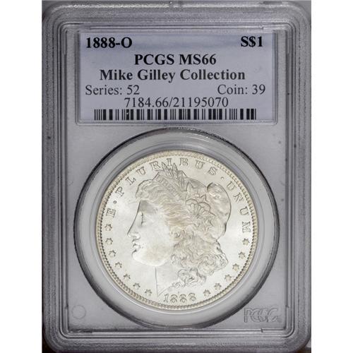 <B>1888-O<img border='0' src='http://www.heritagecoins.com/images/star.gif' width=10 height=10>$1> MS66 PCGS.</B></I> Ex: Mike Gilley Collection. A frosty and lustrous Gem with exceptional surfaces and strike. All elements are sharply defined, and both sides are fully brilliant, although a hint of champagne toning can be seen on Liberty's cheek and jaw. This is an important opportunity for the advanced specialist to acquire a high-quality example. Population: 126 in 66, 0 finer (1/06).<BR><I>From The Michael Casper Collection, Part Three.</B></I>