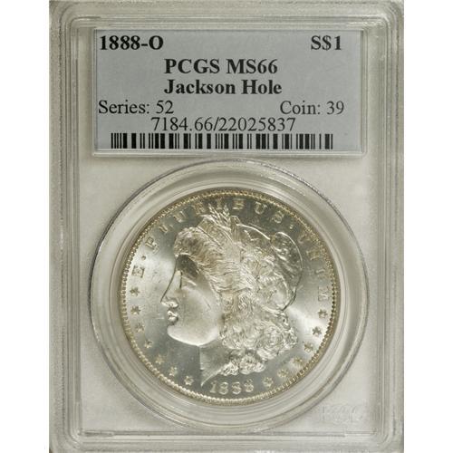<B>1888-O S$1 MS66 PCGS.</B></I> Ex: Jackson Hole. Largely untoned with just a few flecks of reddish-brown patina on the reverse. The luster is surprisingly potent, and the strike is uncommonly bold, particularly at the highpoints. While the 1888-O is encountered often in lower grades, PCGS has graded no coins finer (2/07).<BR><I>From The Jackson Hole Collection.</B></I><BR><BR><b>Shipping:</b> Coins & Currency (<a target="_blank" href="http://www.heritageauctions.com/common/shipping.php">view shipping information</a>)
