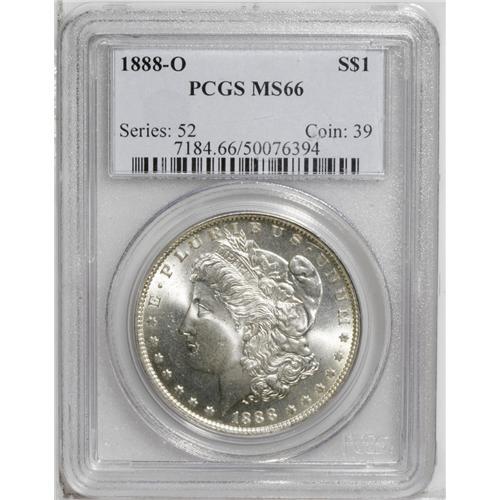 <B>1888-O<img border='0' src='http://www.heritagecoins.com/images/star.gif' width=10 height=10>$1> MS66 PCGS.</B></I> Striking quality varies greatly on 1888-O dollars, and if one has been holding out for an absolute full strike, then this is the coin. Additionally, the surfaces are extraordinarily clean with smooth, satiny mint luster and the coin is untoned on each side. None have received a higher numerical grade assessment from PCGS (7/06).
