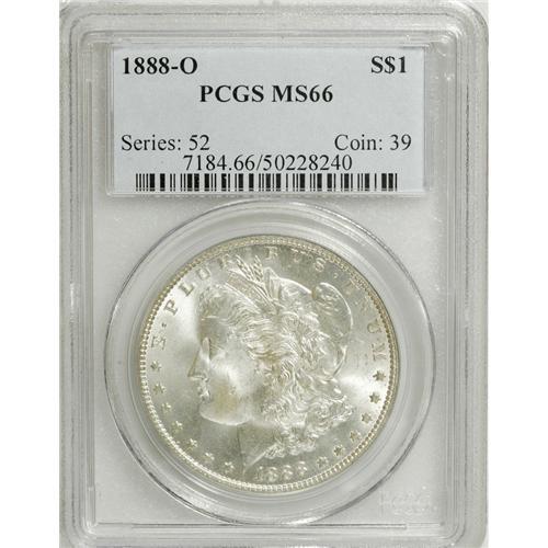 <B>1888-O S$1 MS66 PCGS.</B></I> While a common coin through the lower levels of Mint State, Premium Gem examples are more challenging, and anything finer is virtually unobtainable. This radiantly lustrous MS66 piece displays hints of light gold-tan color under magnification, and reveals just a few minute marks. The design elements are weak in the centers, as are 80 to 90% of survivors (David Bowers, 2006), otherwise, this outstanding specimen might just have vaulted into the next highest grade designation!<BR><BR><b>Shipping:</b> Coins & Currency (<a target="_blank" href="http://www.heritageauctions.com/common/shipping.php">view shipping information</a>)