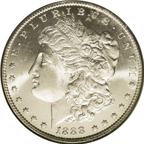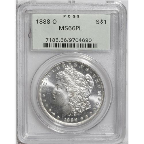 <B>1888-O<img border='0' src='http://www.heritagecoins.com/images/star.gif' width=10 height=10>$1> MS66 Prooflike PCGS.</B></I> Among the more plentiful Morgan dollars with a Prooflike finish, the 1888-O is, nevertheless, very scarce at the present grade. Each side displays a light cameo contrast, the razor sharp striking definition and flashy, completely untoned surfaces provide for outstanding aesthetic appeal. Population: 8 in 66 Prooflike, none are finer at either service (7/06).