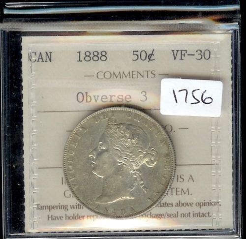 1888 Obverse 3, ICCS VF-30, lightly toned, key date. Nice example.