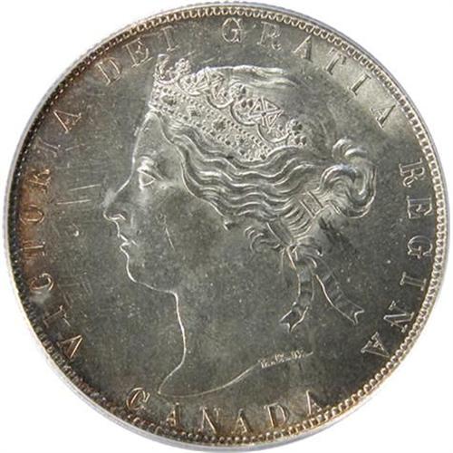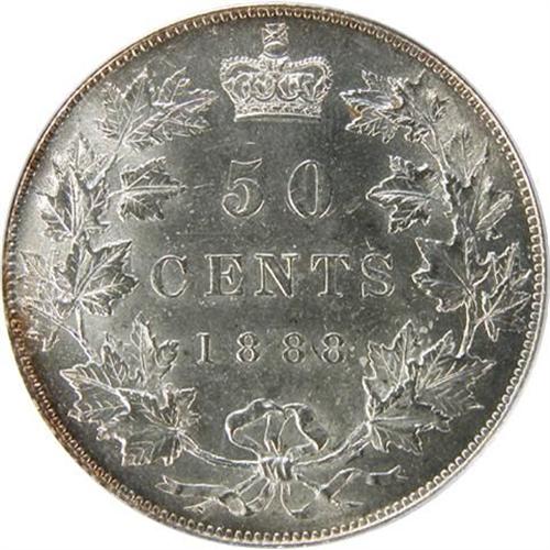 Canada Fifty Cents 1888 Obverse 3 ICCS and PCGS MS-63. This is a fully struck and strongly lustrous piece that has a pale golden toning with light amber rim accents. It is tied with two others as the highest of only six mintstate examples of all varieties of the date that have been certified by ICCS, and PCGS has graded none higher