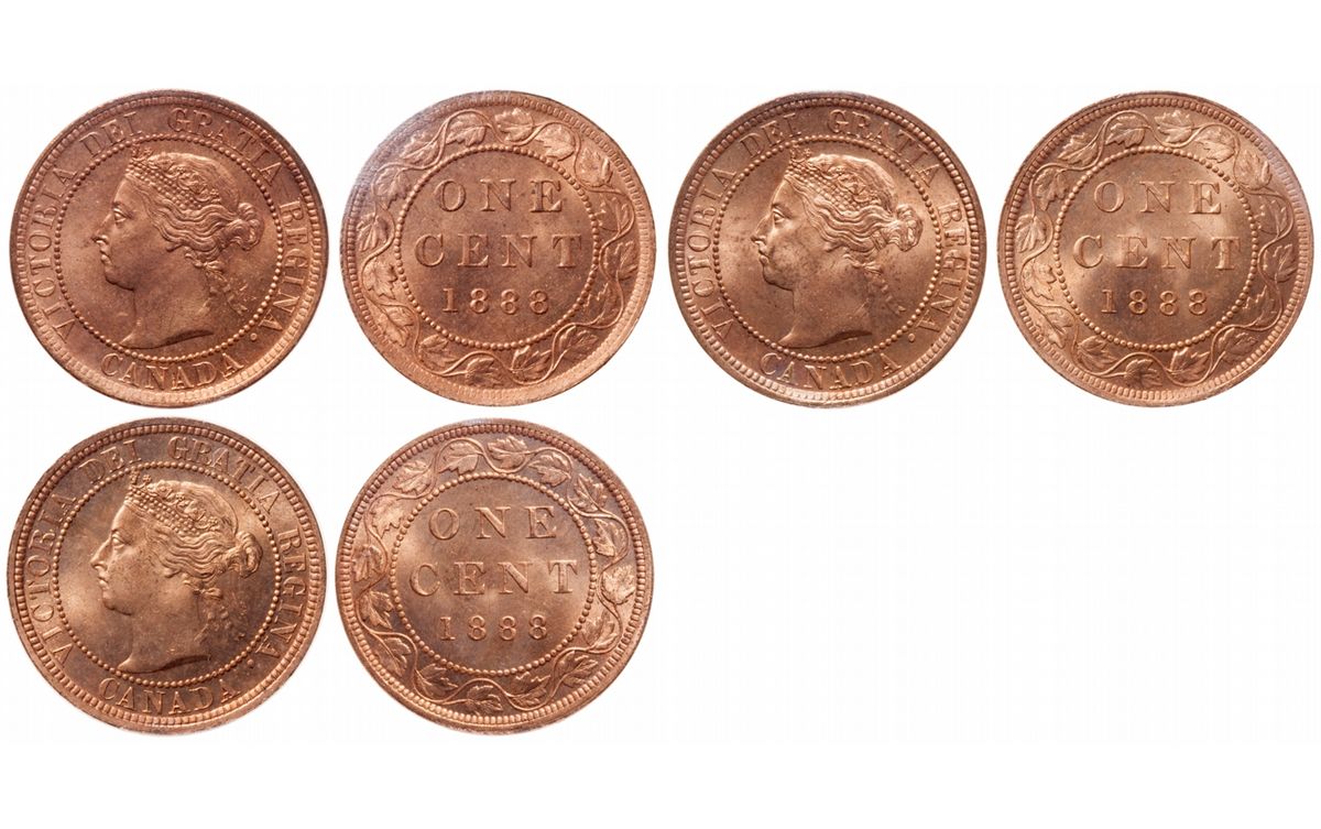 1888. Re-cut middle '8'. ICCS Mint State-66. Red. 90% even red-gold luster; 1888. Normal date. ICCS Mint State-66. Red. 90% red luster. (2 pcs.). Total of three (3) pieces.