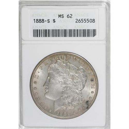 <B>1888-S $1 MS62 ANACS.</B></I> NGC Census: (503/1620). PCGS Population (807/2991). Mintage: 657,000. Numismedia Wsl. Price for NGC/PCGS coin in MS62: $225. (#7186)<BR><BR><B>Coin Engraver:</B> George T. Morgan<BR><BR><b>Shipping:</b> Coins & Currency (<a target="_blank" href="http://www.heritageauctions.com/common/shipping.php">view shipping information</a>\)