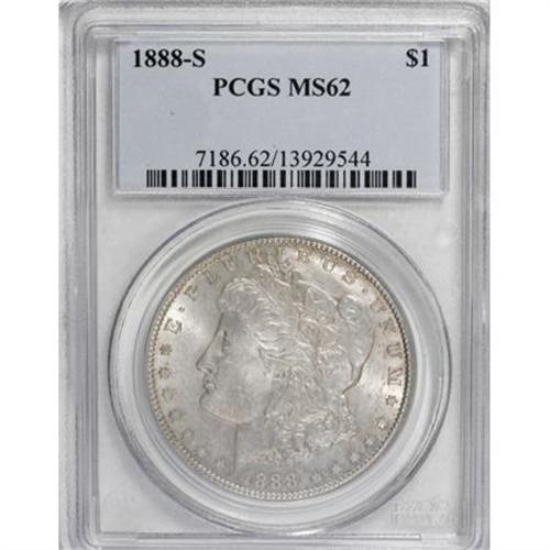 <B>1888-S $1 MS62 PCGS.</B></I> . PCGS Population (832/3194). NGC Census: (519/1652). Mintage: 657,000. Numismedia Wsl. Price for NGC/PCGS coin in MS62: $250. (#7186)<BR><BR><B>Coin Engraver:</B> George T. Morgan<BR><BR><b>Shipping:</b> Coins & Currency (<a target="_blank" href="http://www.heritageauctions.com/common/shipping.php">view shipping information</a>)
