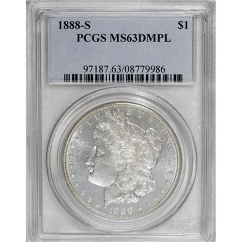 <B>1888-S $1 MS63 Deep Mirror Prooflike PCGS.</B></I> Boldly struck with a slight degree of milkiness scattered over the otherwise untoned surfaces. The fields are flashy and dramatically prooflike; a scarce attribute for a member of this San Francisco issue. Mild scuffiness limits the numeric grade. <BR><BR><b>Shipping:</b> Coins & Currency (<a target="_blank" href="http://www.heritageauctions.com/common/shipping.php">view shipping information</a>)