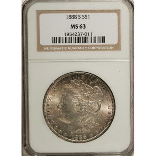 <B>1888-S $1 MS63 NGC.</B></I> NGC Census: (725/895). PCGS Population (1612/1379). Mintage: 657,000. Numismedia Wsl. Price for NGC/PCGS coin in MS63: $367. (#7186)<BR><BR><b>Shipping:</b> Coins & Currency (<a target="_blank" href="http://www.heritageauctions.com/common/shipping.php">view shipping information</a>)