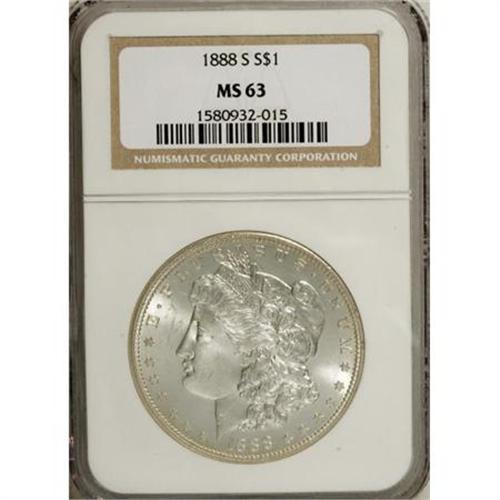 <B>1888-S $1 MS63 NGC.</B></I> NGC Census: (729/895). PCGS Population (1629/1427). Mintage: 657,000. Numismedia Wsl. Price for NGC/PCGS coin in MS63: $367. (#7186)<BR><BR><B>Coin Engraver:</B> George T. Morgan<BR><BR><b>Shipping:</b> Coins & Currency (<a target="_blank" href="http://www.heritageauctions.com/common/shipping.php">view shipping information</a>\)
