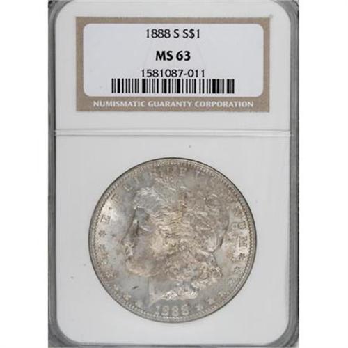 <B>1888-S $1 MS63 NGC.</B></I> NGC Census: (732/896). PCGS Population (1644/1439). Mintage: 657,000. Numismedia Wsl. Price for NGC/PCGS coin in MS63: $367. (#7186)<BR><BR><B>Coin Engraver:</B> George T. Morgan<BR><BR><b>Shipping:</b> Coins & Currency (<a target="_blank" href="http://www.heritageauctions.com/common/shipping.php">view shipping information</a>)