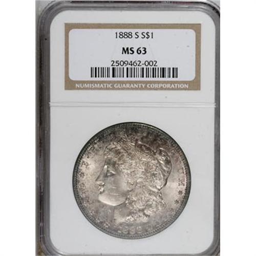 <B>1888-S $1 MS63 NGC.</B></I> NGC Census: (732/896). PCGS Population (1667/1462). Mintage: 657,000. Numismedia Wsl. Price for NGC/PCGS coin in MS63: $367. (#7186)<BR><BR><B>Coin Engraver:</B> George T. Morgan<BR><BR><b>Shipping:</b> Coins & Currency (<a target="_blank" href="http://www.heritageauctions.com/common/shipping.php">view shipping information</a>)