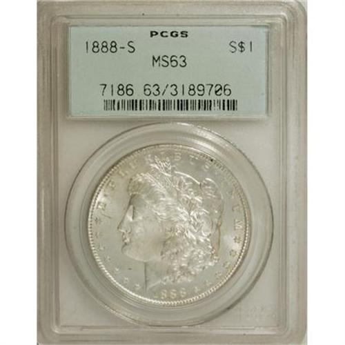 <B>1888-S $1 MS63 PCGS.</B></I> PCGS Population (1629/1427). NGC Census: (729/895). Mintage: 657,000. Numismedia Wsl. Price for NGC/PCGS coin in MS63: $367. (#7186)<BR><BR><B>Coin Engraver:</B> George T. Morgan<BR><BR><b>Shipping:</b> Coins & Currency (<a target="_blank" href="http://www.heritageauctions.com/common/shipping.php">view shipping information</a>\)