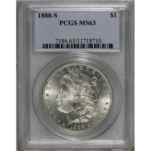 <B>1888-S $1 MS63 PCGS.</B></I> PCGS Population (1713/1506). NGC Census: (755/905). Mintage: 657,000. Numismedia Wsl. Price for NGC/PCGS coin in MS63: $375. (#7186)<BR><BR><B>Coin Engraver:</B> George T. Morgan<BR><BR><b>Shipping:</b> Coins & Currency (<a target="_blank" href="http://www.heritageauctions.com/common/shipping.php">view shipping information</a>)