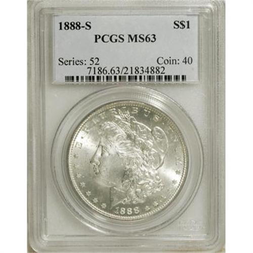 <B>1888-S $1 MS63 PCGS.</B></I> PCGS Population (1720/1515). NGC Census: (755/908). Mintage: 657,000. Numismedia Wsl. Price for NGC/PCGS coin in MS63: $375. (#7186)<BR><BR><B>Coin Engraver:</B> George T. Morgan<BR><BR><b>Shipping:</b> Coins & Currency (<a target="_blank" href="http://www.heritageauctions.com/common/shipping.php">view shipping information</a>)