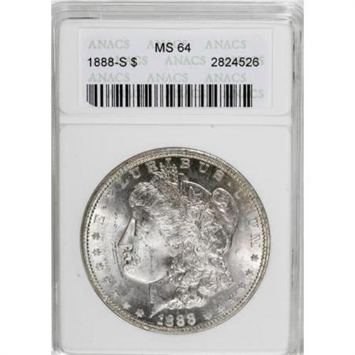 <B>1888-S $1 MS64 ANACS.</B></I> NGC Census: (782/114). PCGS Population (1219/220). Mintage: 657,000. Numismedia Wsl. Price for NGC/PCGS coin in MS64: $675. (#7186)<BR><BR><B>Coin Engraver:</B> George T. Morgan<BR><BR><b>Shipping:</b> Coins & Currency (<a target="_blank" href="http://www.heritageauctions.com/common/shipping.php">view shipping information</a>)