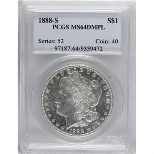 <B>1888-S $1 MS64 Deep Mirror Prooflike PCGS.</B></I> A silver-white near-Gem that boasts prominently mirrored fields. Well struck and only mildly abraded. Liberty's cheek displays a few mint-made roller marks. A lower mintage issue that carries a strong premium, even in circulated grades. Only a minute percentage of survivors possess deeply mirrored fields. Population: 41 in 64 DMPL, 4 finer (6/07).<BR><I>From the Diamond Head Registry Set of Prooflike Dollars.</B></I><BR><BR><b>Shipping:</b> Coins & Currency (<a target="_blank" href="http://www.heritageauctions.com/common/shipping.php">view shipping information</a>)