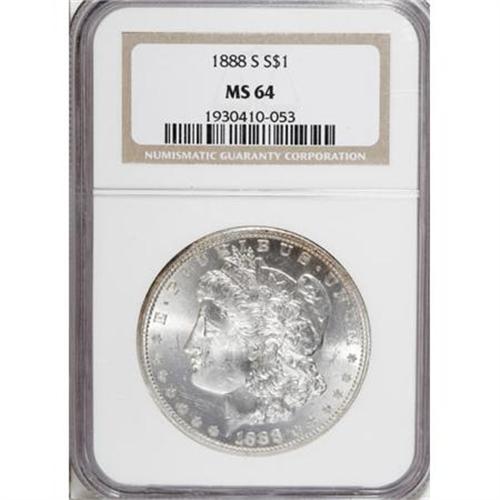 <B>1888-S $1 MS64 NGC.</B></I> An essentially untoned, immensely lustrous Choice example of this S-mint issue, struck a decade after the introduction of the Morgan design. Light, scattered marks appear on the well struck devices, while the fields are comparatively clean.<BR><BR><B>Coin Engraver:</B> George T. Morgan<BR><BR><b>Shipping:</b> Coins & Currency (<a target="_blank" href="http://www.heritageauctions.com/common/shipping.php">view shipping information</a>)