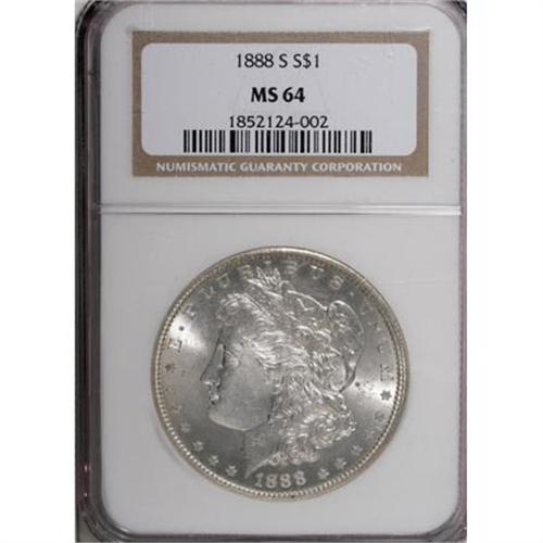 <B>1888-S $1 MS64 NGC.</B></I> Pleasing luster emanates from the silver-gray surfaces of this generally well struck near-Gem. A scattering of minute marks accounts for the grade.<BR><BR><B>Coin Engraver:</B> George T. Morgan<BR><BR><b>Shipping:</b> Coins & Currency (<a target="_blank" href="http://www.heritageauctions.com/common/shipping.php">view shipping information</a>)