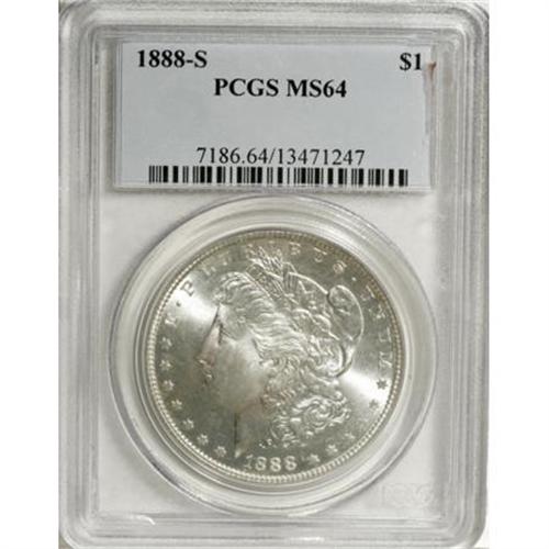 <B>1888-S $1 MS64 PCGS.</B></I> The skimpy mintage of only 657,000 pieces means that this issue is elusive in the higher Mint State grades, especially when found well struck. This frosty coin is such a piece, and only a couple of tiny luster grazes away from Gem.<BR><BR><B>Coin Engraver:</B> George T. Morgan<BR><BR><b>Shipping:</b> Coins & Currency (<a target="_blank" href="http://www.heritageauctions.com/common/shipping.php">view shipping information</a>)