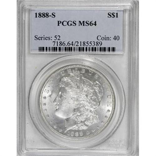 <B>1888-S $1 MS64 PCGS.</B></I> PCGS Population (1219/220). NGC Census: (782/114). Mintage: 657,000. Numismedia Wsl. Price for NGC/PCGS coin in MS64: $675. (#7186)<BR><BR><B>Coin Engraver:</B> George T. Morgan<BR><BR><b>Shipping:</b> Coins & Currency (<a target="_blank" href="http://www.heritageauctions.com/common/shipping.php">view shipping information</a>)