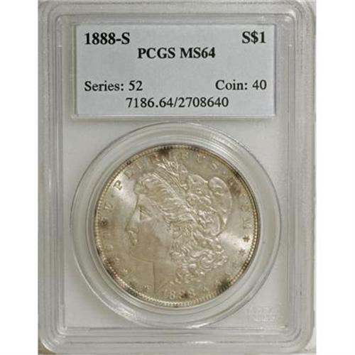 <B>1888-S $1 MS64 PCGS.</B></I> Well struck with a surprising amount of flash that enlivens the otherwise dusky gold-gray surfaces. The fields are pleasingly preserved for the grade, though Liberty's cheek shows a few generally inoffensive marks.<BR><BR><B>Coin Engraver:</B> George T. Morgan<BR><BR><b>Shipping:</b> Coins & Currency (<a target="_blank" href="http://www.heritageauctions.com/common/shipping.php">view shipping information</a>)