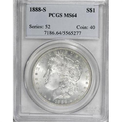 <B>1888-S $1 MS64 PCGS.</B></I> PCGS Population (1255/229). NGC Census: (784/116). Mintage: 657,000. Numismedia Wsl. Price for NGC/PCGS coin in MS64: $675. (#7186)<BR><BR><B>Coin Engraver:</B> George T. Morgan<BR><BR><b>Shipping:</b> Coins & Currency (<a target="_blank" href="http://www.heritageauctions.com/common/shipping.php">view shipping information</a>)