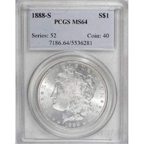 <B>1888-S $1 MS64 PCGS.</B></I> PCGS Population (1255/229). NGC Census: (784/116). Mintage: 657,000. Numismedia Wsl. Price for NGC/PCGS coin in MS64: $675. (#7186)<BR><BR><B>Coin Engraver:</B> George T. Morgan<BR><BR><b>Shipping:</b> Coins & Currency (<a target="_blank" href="http://www.heritageauctions.com/common/shipping.php">view shipping information</a>)