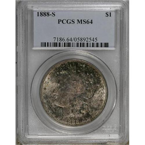 <B>1888-S $1 MS64 PCGS.</B></I> Crisply struck with excellent visual appeal for a near-Gem. The obverse shows strong luster beneath rich, dappled silver-gray, blue-violet, and iridescent toning, while the reverse offers overpowering brilliance.<BR><BR><B>Coin Engraver:</B> George T. Morgan<BR><BR><b>Shipping:</b> Coins & Currency (<a target="_blank" href="http://www.heritageauctions.com/common/shipping.php">view shipping information</a>)