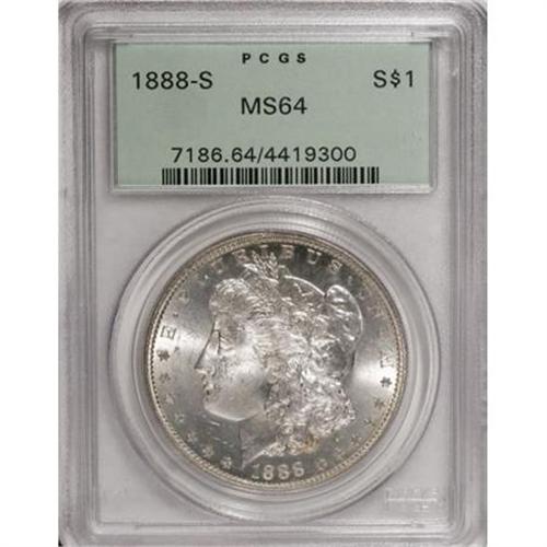 <B>1888-S $1 MS64 PCGS.</B></I> VAM-13. This variety has interesting die gouges above the tail feathers and within the lower left (facing) wing, reminiscent of the 1878-CC VAM-11 Top 100 variety. Thoroughly lustrous and essentially brilliant with attractive preservation. Housed in a green label holder.<BR><BR><B>Coin Engraver:</B> George T. Morgan<BR><BR><b>Shipping:</b> Coins & Currency (<a target="_blank" href="http://www.heritageauctions.com/common/shipping.php">view shipping information</a>)
