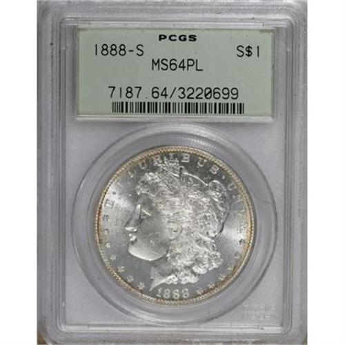 <B>1888-S $1 MS64 Prooflike PCGS.</B></I> While the flashy fields have a degree of cartwheel luster, the surfaces' reflectivity is undeniable. Solidly struck with minimal contrast and hints of peach patina at the margins. A patch of roller marks is present on the cheek. PCGS has graded just three finer Prooflike examples (7/07).<BR><BR><B>Coin Engraver:</B> George T. Morgan<BR><BR><b>Shipping:</b> Coins & Currency (<a target="_blank" href="http://www.heritageauctions.com/common/shipping.php">view shipping information</a>)