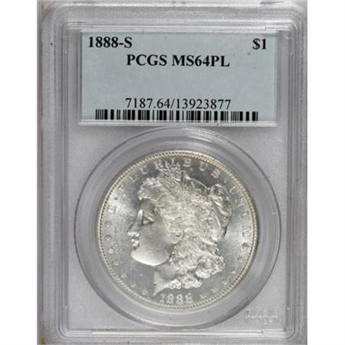 <B>1888-S $1 MS64 Prooflike PCGS.</B></I> This flashy near-Gem displays pleasing field-motif contrast and relatively sharply defined design elements. Untoned surfaces reveal a faint fingerprint in the lower left obverse quadrant. Population: 51 in 64, 3 finer (9/07).<BR><BR><B>Coin Engraver:</B> George T. Morgan<BR><BR><b>Shipping:</b> Coins & Currency (<a target="_blank" href="http://www.heritageauctions.com/common/shipping.php">view shipping information</a>)