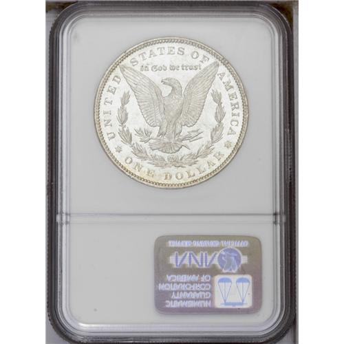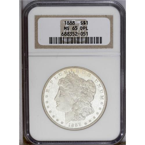 <B>1888<img border='0' src='http://www.heritagecoins.com/images/star.gif' width=10 height=10>$1> MS65 Deep Mirror Prooflike NGC.</B></I> Frosty, sharply struck devices are nicely set off by deeply mirrored fields. Hints of subtle light tan-gold color are evident under magnification, and well preserved surfaces reveal just a few scuffs in the obverse fields. Census: 26 in 65 Deep Mirror Prooflike, 7 finer (2/06).