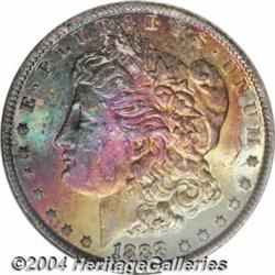 <B>1888<S$1> MS65 NGC.</B></I> One glance at the multicolored areas of toning on the obverse and the viewer soon forgets about scattered field marks that are visible under the color. Shades of light blue, deep red, green, and gold are all present.<BR><I>From the JFS Collection.</B></I> <BR><BR><B>Important notice:</B> Heritage usually auctions material at the rate of 200-250 lots per hour. On some occasions eBay Live bid software or the Internet may not be able to keep up with the pace of the auction. We recommend placing a realistic absentee bid now as insurance to avoid disappointment. Occasionally the auctioneer may eliminate or reject an eBay Live bid, and the auctioneer may also reopen a lot after the close of the eBay live bidding (usually because we missed an audience bid), and may reject your bid even if it shows you as the winning bidder. By bidding via eBay Live, you agree that Heritage may award the lot to another bidder at its sole discretion under the circumstances described above or any other reasonable circumstances. Since eBay bids are not shown to us until we open the lot on the floor, we treat those bids just like floor bids. In most cases the floor responds before the eBay bid is presented to us, due to Internet lag time, so for consistency we have made it a policy that floor bids are always considered first over tie eBay live bids. Also please note that all Heritage lots purchased through eBay Live carry a 20% Buyer's Premium. Please make sure you read the Terms and Conditions before you bid. </span></font></tr></table></td></tr></table>