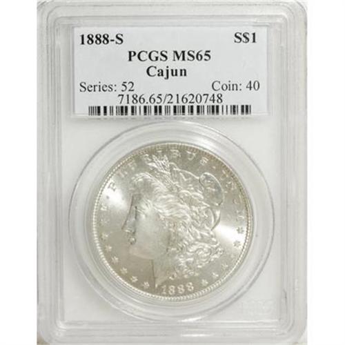 <B>1888-S $1 MS65 PCGS.</B></I> Ex: Cajun. A hint of gold toning visits this lustrous and nicely struck better date dollar. The obverse field is clean, and a few mint-made roller marks above the ear are of no import. The 1888-S is a relatively low mintage date, and is certainly scarcer than the 1878 to 1882 San Francisco emissions.<BR><BR><B>Coin Engraver:</B> George T. Morgan<BR><BR><b>Shipping:</b> Coins & Currency (<a target="_blank" href="http://www.heritageauctions.com/common/shipping.php">view shipping information</a>\)