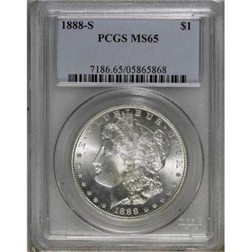 <B>1888-S $1 MS65 PCGS.</B></I> Sharply struck for this San Francisco issue with vibrant luster and amazing eye appeal. Minimally toned with few flaws and a small patch of roller marks on the chin.<BR><BR><B>Coin Engraver:</B> George T. Morgan<BR><BR><b>Shipping:</b> Coins & Currency (<a target="_blank" href="http://www.heritageauctions.com/common/shipping.php">view shipping information</a>)