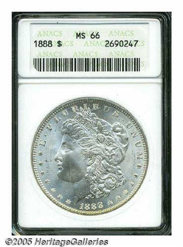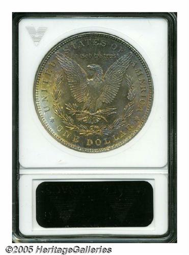 <B>1888<S$1> MS66 ANACS.</B></I> Frosty and attractive. The obverse is brilliant. The reverse exhibits vivid "end-of-roll" toning in shades of blue, violet, and gold.