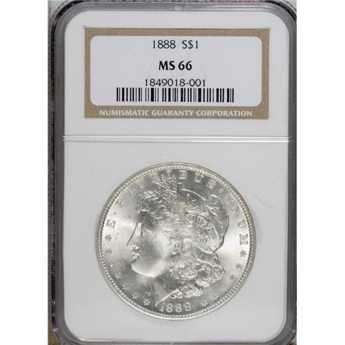 <B>1888 S$1 MS66 NGC.</B></I> Glowing luster radiates from untoned surfaces that present a somewhat satiny finish. Sharply struck throughout, and minimally abraded.<BR><BR><b>Shipping:</b> Coins & Currency (<a target="_blank" href="http://www.heritageauctions.com/common/shipping.php">view shipping information</a>)