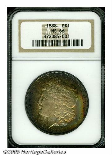 <B>1888<S$1> MS66 NGC.</B></I> Variegated rainbow toning blankets the peripheral obverse areas, while the reverse is completely untoned. Well struck throughout, this coin reveals lovingly preserved surfaces that confirm the grade.