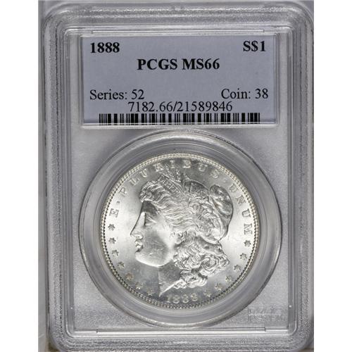 <B>1888<img border='0' src='http://www.heritagecoins.com/images/star.gif' width=10 height=10>$1> MS66 PCGS.</B></I> This untoned piece has great luster and a typical strike for the issue, with slight flatness in the center of the obverse and on the stars. A sparkling example of a Philadelphia Mint dollar.<BR><I>From The Chicago-Ark Collection.</B></I>