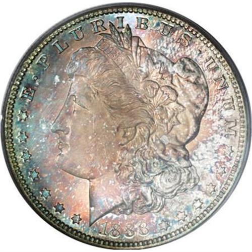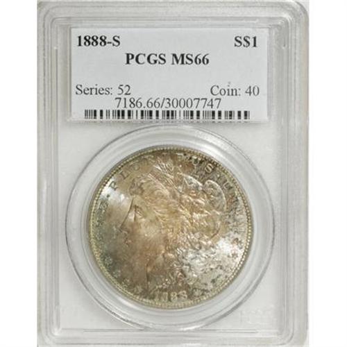 <B>1888-S $1 MS66 PCGS.</B></I> Formerly sold as lot 4210 in our sale of Morris Silverman's Silver Dollar Collection, where it was described in part as: "We have offered very few MS66 examples of this issue, and for good reason. There are very few 1888-S dollars known in high grades ... Liberty's cheek is smooth and unblemished. In fact, the only noticeable abrasions on this piece are located on the reverse. Richly toned in varying shades of golden, rose, blue, and citrine on the obverse, the reverse shows a light, even golden patina." Population: 18 in 66, 2 finer (12/07).<BR><I>From The Jimmy G. PCGS Registry Collection of Morgan Dollars with Varieties.</B></I><BR><BR><B>Coin Engraver:</B> George T. Morgan<BR><BR><b>Shipping:</b> Coins & Currency (<a target="_blank" href="http://www.heritageauctions.com/common/shipping.php">view shipping information</a>)