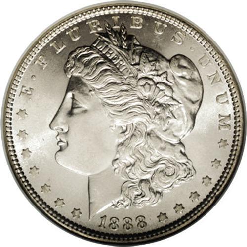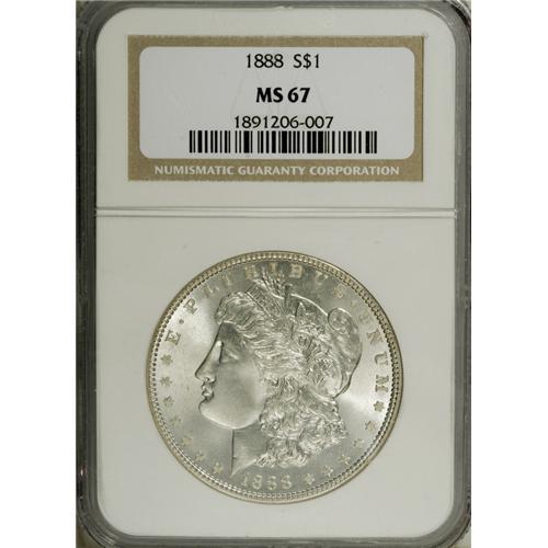 <B>1888 S$1 MS67 NGC.</B></I> A liberal coating of thick mint frost evenly covers both the fields and the devices, essentially eliminating any contrast. While this coin is in no danger of winning an NGC Prooflike designation, if that service offered a Pristine designation, the piece would be a strong contender. Only a slight dusting of the most picayune contact marks grazes Liberty's cheek, but elsewhere they are notably absent.<BR><BR><b>Shipping:</b> Coins & Currency (<a target="_blank" href="http://www.heritageauctions.com/common/shipping.php">view shipping information</a>)