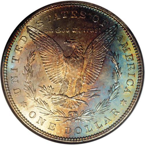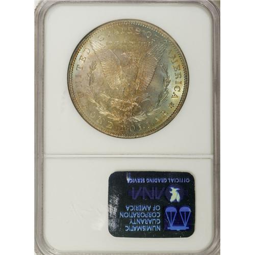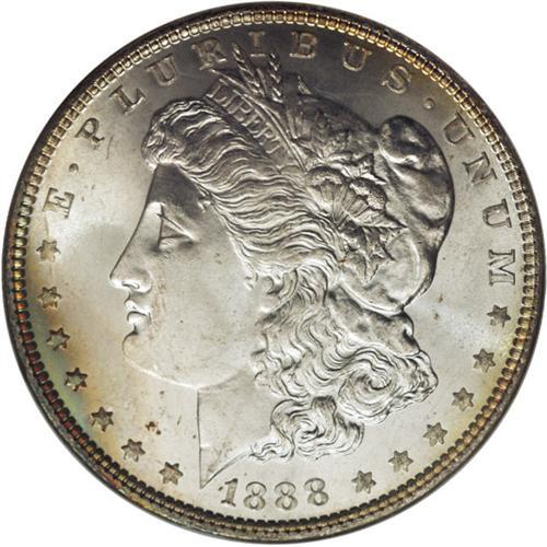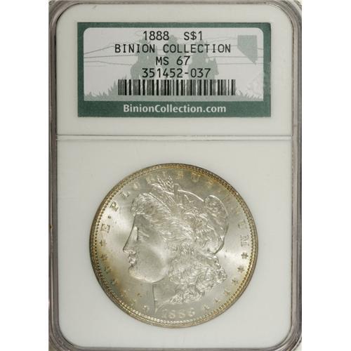 <B>1888 S$1 MS67 NGC.</B></I> Ex: Binion Collection. Attractive amber-gold, cobalt-blue, and mint-green patina adorns the reverse, while the obverse is largely brilliant, save for a crescent of amber-gold at the right rim. Few examples of this otherwise available issue have received this lofty grade. Certified in an NGC "Binion Collection" encapsulation. Census: 35 in 67, 1 finer (4/07).<BR><BR><b>Shipping:</b> Coins & Currency (<a target="_blank" href="http://www.heritageauctions.com/common/shipping.php">view shipping information</a>)