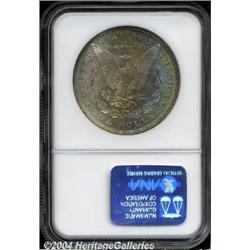 <B>1888<S$1> MS67 NGC.</B></I> Ex: Binion Collection. Attractive amber and cobalt-blue toning adorns the reverse. Precious few examples of this otherwise available issue have received this lofty grade. Population: 21 in 67, 0 finer (4/04). <BR><BR><B>Important notice:</B> Heritage usually auctions material at the rate of 200-250 lots per hour. On some occasions eBay Live bid software or the Internet may not be able to keep up with the pace of the auction. We recommend placing a realistic absentee bid now as insurance to avoid disappointment. Occasionally the auctioneer may eliminate or reject an eBay Live bid, and the auctioneer may also reopen a lot after the close of the eBay live bidding (usually because we missed an audience bid), and may reject your bid even if it shows you as the winning bidder. By bidding via eBay Live, you agree that Heritage may award the lot to another bidder at its sole discretion under the circumstances described above or any other reasonable circumstances. Since eBay bids are not shown to us until we open the lot on the floor, we treat those bids just like floor bids. In most cases the floor responds before the eBay bid is presented to us, due to Internet lag time, so for consistency we have made it a policy that floor bids are always considered first over tie eBay live bids. Also please note that all Heritage lots purchased through eBay Live carry a 20% Buyer's Premium. Please make sure you read the Terms and Conditions before you bid.