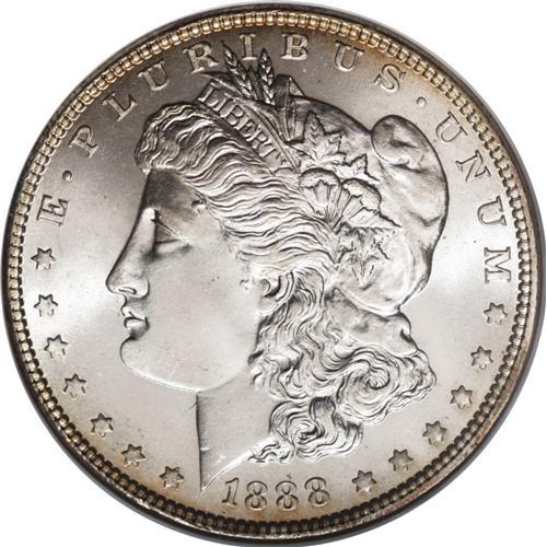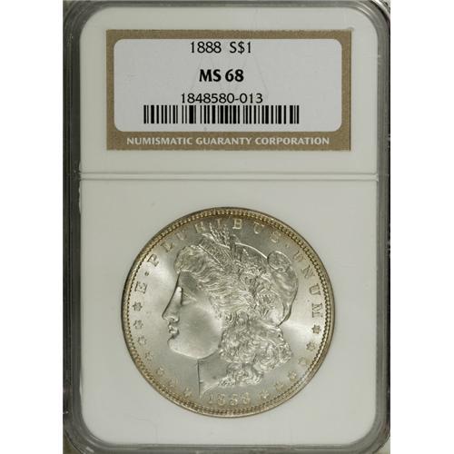 <B>1888 S$1 MS68 NGC.</B></I> This piece is sharply struck and highly lustrous with frosty silver surfaces that are accented by a trace of light gold toning along the obverse and reverse borders. While the mintage of 1888 Morgan dollars was nearly equal to that of 1887, it appears that a smaller number were stored in the Treasury over the years, and today the total population for this date is only one-quarter that of 1887. Even still, over 25,000 have been certified by NGC; however, just this one coin has received the MS68 grade by this grading company. As PCGS has never certified an example at this grade level, the present piece qualifies as the single finest example certified by either NGC or PCGS, a unique coin in such fine quality.<BR><BR><b>Shipping:</b> Coins & Currency (<a target="_blank" href="http://www.heritageauctions.com/common/shipping.php">view shipping information</a>)